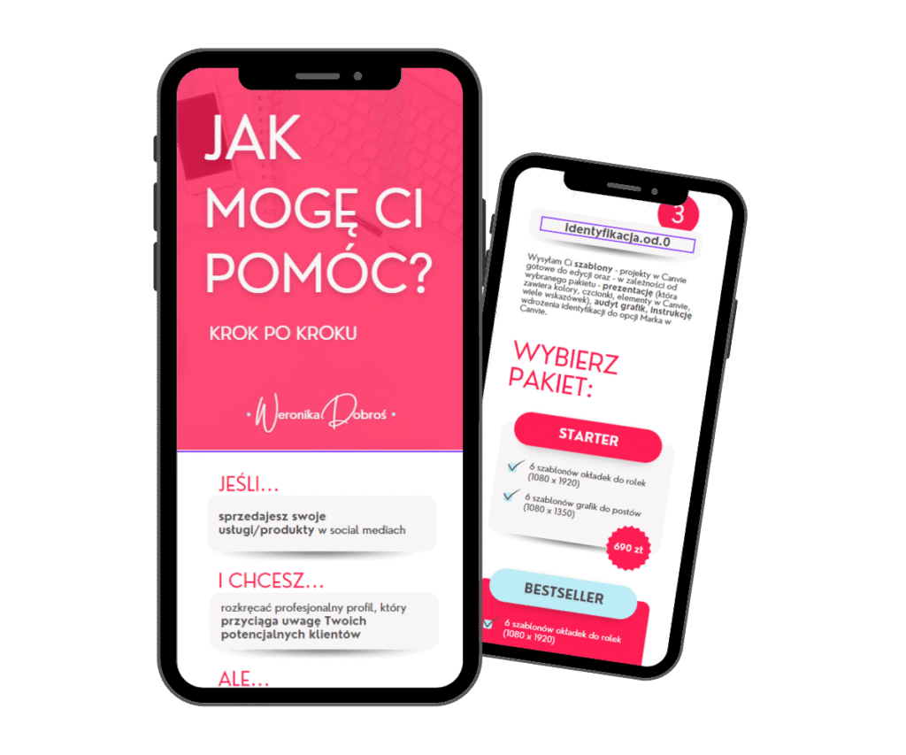 Strona w Canvie, czyli tak zwane landing page, dla mnie są mega turbo ułatwianiem! Po pierwsze nie muszę mieć swojej strony internetowej, czyli zatrudniania pracowników/programistów, a mogę łatwo odesłać klienta do wizytówki wydarzenia. Również mogę podpiąć link, który będzie od razu przekierowywał do formularza, czy do płatności. Mega ułatwienie, no i jest spójne – nie muszę też nikomu mówić jak ma wyglądać, ponieważ Werka zrobiła dla mnie identyfikację, więc landing page jest tylko przedłużeniem mojej oferty 🙂